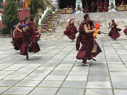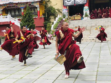跳神儀式開始,南無寺內(nèi)鼓號(hào)齊鳴,喇嘛身著顯耀盛裝,點(diǎn)燃新綠松枝,幾縷藍(lán)色煙紋升起。一支由法鼓、鈸、海螺、法號(hào)等組成的寺廟樂隊(duì)自大殿而出,順時(shí)針繞場一周落座場邊,群神出場繞圈而舞,以示凈化場地,祈請(qǐng)諸神入位。接著,象征護(hù)法神舞、骷髏舞、鹿神舞、黑帽咒師舞和金剛力士舞的演員手持各類法器挨個(gè)入場手舞足蹈。舞蹈的起落根 據(jù)場邊奏響的器樂節(jié)奏進(jìn)行。最后由眾神驅(qū)鬼逐邪,押送“朵馬”(由糌粑捏成用以供神施鬼的食品)至寺外拋丟焚燒,以示驅(qū)逐一年的邪魔,祈禱來年安樂。