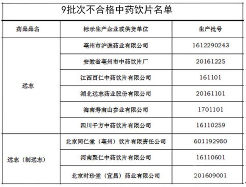 其中,亳州市滬譙藥業(yè)有限公司、江西百仁中藥飲片有限公司、湖北遠志藥業(yè)股份有限公司、海南壽南山參業(yè)有限公司、四川千方中藥飲片有限公司等企業(yè)生產(chǎn)的6批次遠志不合格,不合格項目為黃曲霉毒素。