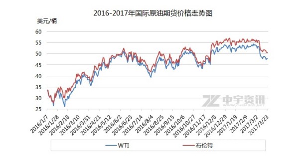 2017年3月以來,國(guó)際油價(jià)持續(xù)走低。3月7日,美國(guó)WTI原油期貨在53美元形成下行拐點(diǎn),隨后連跌四日,在48、49美元附近持穩(wěn)數(shù)日后繼續(xù)小幅下跌。截至3月24日收盤,美國(guó)WTI原油期貨報(bào)47.97美元/桶。