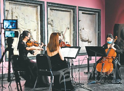 在西安碑林博物館昭陵六駿石刻前,西安交響樂(lè)團(tuán)“弦上莫奈四重奏”為“云上國(guó)寶”音樂(lè)會(huì)彩排。