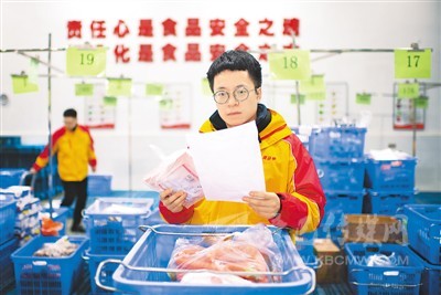 陜西黃馬甲物流配送股份有限公司生鮮中央工廠的工作人員認(rèn)真核對(duì)供應(yīng)鏈產(chǎn)品。