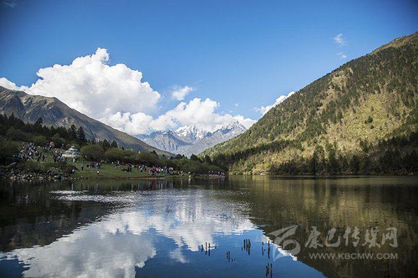 藥池沸泉一側(cè)是風(fēng)景秀美的俄瑪錯,上頂藍天白云和雪山,下踏森林綠水,讓人透心舒暢。