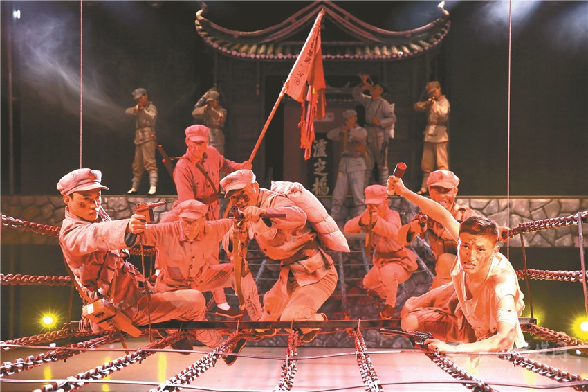 本網(wǎng)訊 在身著紅軍服、打著“火把”的戰(zhàn)士的引領(lǐng)下,觀眾緩緩而行,在經(jīng)歷一場(chǎng)激烈的戰(zhàn)斗后,大家走過銷煙彌漫的戰(zhàn)場(chǎng),來到實(shí)景劇場(chǎng),以一位“親歷者”的身份“穿越”至歷史的場(chǎng)景。幽深的河谷、洶涌的波濤、兇殘的敵人、英勇的戰(zhàn)士、激烈的戰(zhàn)斗……隨著劇情的展開,讓人親臨其境84年前那場(chǎng)驚天動(dòng)地的重要戰(zhàn)役——《飛奪瀘定橋》。