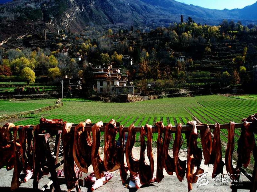 丹巴嘉絨藏族年期間,在酸菜包子、火燒饃、香豬腿等眾多的風(fēng)味飲食中,“藏香豬腿”是必不可缺的美食佳肴,也是給長輩拜年和親朋好友間互送的最佳禮品。“藏香豬腿”的制作方式也象丹巴嘉絨藏族年一樣的獨特。丹巴人宰殺年豬的方式通常有用繩索死吊或者用刀從勁入殺心臟致死兩種,現(xiàn)在采用后一種方式宰殺豬居多。當?shù)厝藢⒇i宰殺后用熱水燙,處理好豬毛,再在胸口用刀開一孔,將手伸人胸腔扯斷心肺連接處,然后將其剖開,并把肥、瘦豬肉分離開,剝?nèi)グ逵?,處理好其他?nèi)臟,將豬腿按原形分離,爾后經(jīng)霜凍、柏枝熏、自然風(fēng)干后存放在儲藏室內(nèi)。豬腿存放一冬后,色、香、味俱佳。食用時煮成半熟或用炭火將表皮烘烤,切成小塊狀或撕成粉絲狀,在百米內(nèi)即可聞到香味,入口鮮嫩清香,營養(yǎng)豐富,誘人食欲。