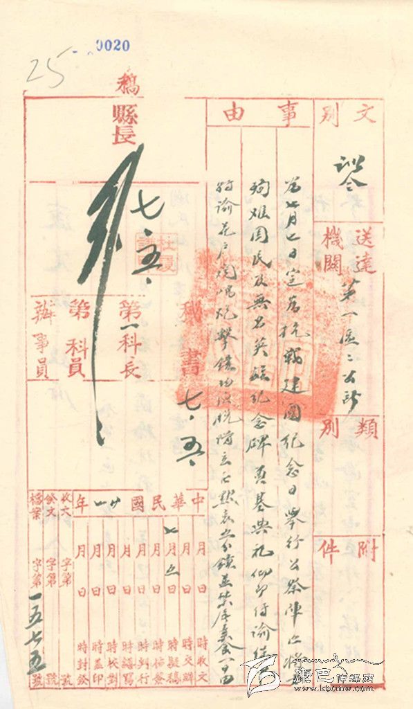 民國27年,即1838年7月5日,康定縣政府縣長杜履謙發(fā)出“訓令”,內(nèi)容如下:“查7月7日為盧溝橋抗戰(zhàn)周年紀念日,經(jīng)民國政府軍事委員會電請行政院特令各省市、鎮(zhèn):特定是日為抗戰(zhàn)建國紀念日。是日全體民眾均應向抗戰(zhàn)陣亡將士及死難國民舉行公祭,并舉行無名英雄紀念碑奠基典禮。正午12時,聞中山臺鳴炮,警察籌備處擊鐘,本城全市民,無論室內(nèi)室外,一律脫帽立正默哀五分鐘。禁止屠宰,素食一日。此令”。