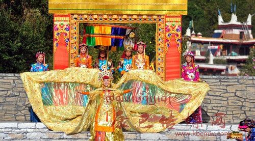 在催人奮進的戰(zhàn)鼓聲中,一群身披甲胄的士兵拿著長劍,背著巨弓走到臺前,在鏗鏘的戰(zhàn)鼓聲中,戰(zhàn)士們做著各種競技動作,模仿武士們互相攻擊的樣子,那矯健的身影展示了遠古時代嘉絨藏族先民們?yōu)榱松媾c自然努力抗爭的場景。過了一會兒音樂一轉(zhuǎn),戰(zhàn)鼓聲漸漸減弱,在鳥雀的陣陣啾啾聲中,一座木門慢慢的開啟,一位身披長袍、頭戴鳳冠的女王在眾多美女的簇擁下,緩緩走下臺階步入舞臺中央,此時,一位手捧托盤的老者來到女王面前單膝下跪,將托盤高舉過頂,并邀請女王品嘗佳肴,女王將中指在酒中蘸了蘸,并曲起中指向四周輕輕彈去,寓意愿將杯中美酒與四方百姓同飲。在女王面前還放置著一個凈水桶,桶中盛滿了清澈的甘泉,桶上橫放著一枝柏樹枝,女王伸出纖纖玉手,拿著柏樹枝在水中蘸了蘸,面向墨爾多神山撒去,寓意向神山祈福。這是此次《美人谷·丹巴》節(jié)目展演中的序曲部分,有著強烈的東女神韻,將遠古時代東女國女王遺風展演的淋漓盡致。