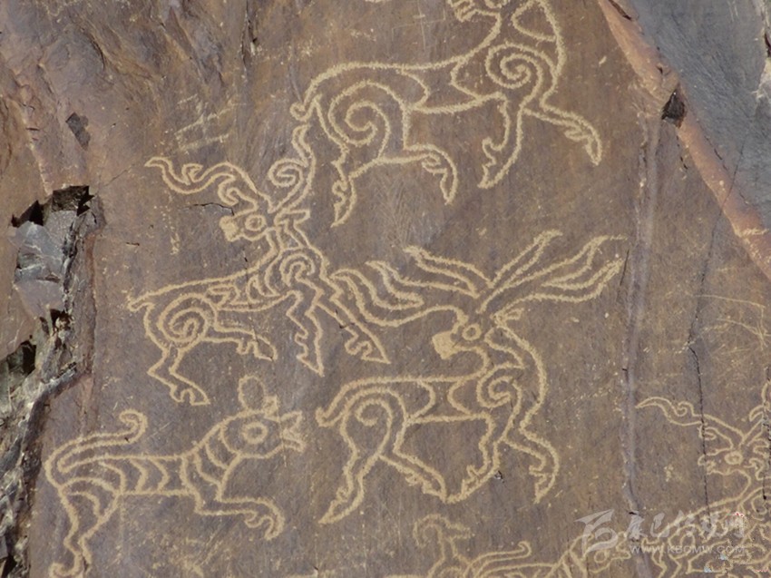 這個傳說暗合了青藏高原上的遠古美術(shù),在西藏日土縣任姆棟遺址發(fā)現(xiàn)新石器時期的巖畫,就是使用堅硬材質(zhì)在巖石表面來刻畫圖像的。從這些巖畫上我們可以看出,西藏美術(shù)所具備的兩個藝術(shù)基因:一是以線造形的方式,二是裝飾性的畫風(fēng)。這兩個基因至今還在唐卡中保留著。