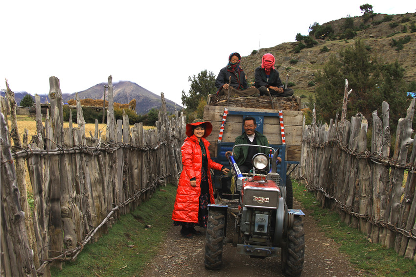 不久雨停下來(lái),山邊露出一縷陽(yáng)光,天空又是一片碧藍(lán)。我們趕緊繞道藍(lán)湖驛站后面的牧場(chǎng)上,發(fā)現(xiàn)一座臨時(shí)搭建的軍用鐵橋可是通向一個(gè)小島。走過(guò)去,島上景色更美,遠(yuǎn)處雪山冰川倒影晶瑩碧藍(lán)的水中,近處綠樹滿山,草場(chǎng)上牛羊星星點(diǎn)點(diǎn)。島上的小村莊叫阿日村,住著十幾戶人家,青稞剛收獲完畢,男人正忙著把牛羊過(guò)冬的草料堆積在高高的木架子上,女人除了撿牛糞外,還要準(zhǔn)備冬天取暖的柴薪。雖然村民大多不能講漢語(yǔ),但對(duì)陌生人通常會(huì)含笑致意,一個(gè)小伙子還用結(jié)結(jié)巴巴的漢語(yǔ)重復(fù)了兩遍“喝不,青稞酒?”。我們到村民達(dá)娃卓瑪家,她是家里四個(gè)孩子中的老大,今年二十二歲,最小的弟弟不到五歲。她上過(guò)三年小學(xué),能講一點(diǎn)漢語(yǔ),臨時(shí)充當(dāng)家人的翻譯。父母和奶奶見有客人來(lái),非常熱情,立馬打酥油茶,并端上一盤奶渣,因?yàn)椴粫?huì)講漢語(yǔ),只好不停招呼我們“吃,多吃”。家里的客堂兼經(jīng)堂寬敞干凈,廊柱和供案施以彩繪,供案上擺放兩個(gè)活佛的一尺見方的照片,前排供了酥油燈、糌粑和清水。