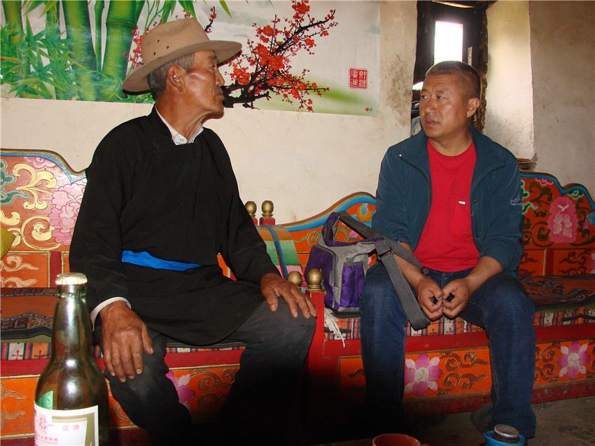 半扇門鄉(xiāng)臘月山一村就座落在這條溝谷里。村寨中,山歌傳承人孫文權(quán)不但在村寨里帶動青年男女們唱響了“啦啦調(diào)”山歌,也帶動了周邊村寨中的青年男女們一起學(xué)唱,山歌在這里得到了很好的保護(hù)和傳承。為了對“啦啦調(diào)”山歌傳承人孫文權(quán)大叔有一個比較系統(tǒng)的了解,在一個春日的早晨,我背上相機(jī)、攝像機(jī)等采訪器材向著臘月山一村進(jìn)發(fā)。走在山道上,一夜雨后,遠(yuǎn)處一片白霧從遙遠(yuǎn)的墨爾多神山與九道溝叢林之間飄來,悠悠晃晃的,最后罩在小金河谷上,彌漫開來,一會兒的功夫,就將河谷兩岸的樹木和藏寨都擁進(jìn)自己的懷里。走了許久,眼前的山道明顯的開闊了許多。幾座白色的藏房掩映在綠樹叢中,房屋頂?shù)乃慕巧?,獵獵的風(fēng)馬旗迎風(fēng)飄揚。孫文權(quán)的房屋就在眼前這片藏寨中,房屋的外墻上,用淡紅色和黑色的線條勾勒出山川河流的樣子。走進(jìn)大門,孫文權(quán)大叔熱情的邀請我就座,并為我斟滿酥油茶,我們的話題就從嘉絨山歌“啦啦調(diào)”開始。