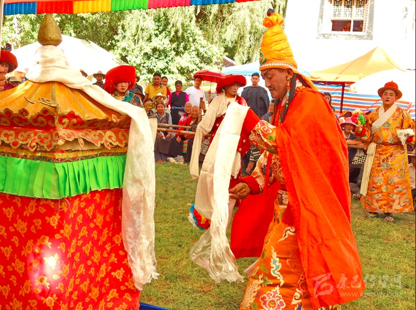 初次看到巴塘藏戲是康巴衛(wèi)視藏歷春晚,原以為是寺廟舞蹈,在唱聲杳杳里類似川劇的喉腔讓我覺得新奇,于是找些資料看看了巴塘藏戲介紹。藏戲的開山鼻祖唐東杰布。藏民歷來把他看作是創(chuàng)造藏戲的戲神和修建橋梁的鐵木工匠的“祖師”,是藏族人民心目中智慧、力量的化身。他將佛教經(jīng)典中的傳記同民間傳說、神話故事等內(nèi)容融在一起,創(chuàng)作出一種具有人物性格和舞蹈、唱腔相結(jié)合的表演藝術(shù),使過去單一的跳神舞逐漸地戲劇化,表現(xiàn)手段也不斷加強,并從宗教儀式中分離出來,形成了藏劇藝術(shù)的雛形。