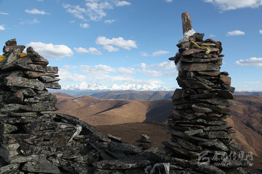 在高爾寺山頂,一個標注有海拔4412米的藍底標志牌顯得有些孤單,與之相伴的,除了呼嘯的大風外,還有隨風飄動的嘛呢旗。頭頂?shù)乃{天沒有一朵云彩,遠處的雪山格外潔白耀眼,曾經(jīng)繁茂的小草已經(jīng)枯黃了,幾朵不知名的野花在寒風中書寫著最后的輝煌,仿佛在向人們宣誓著它的存在。