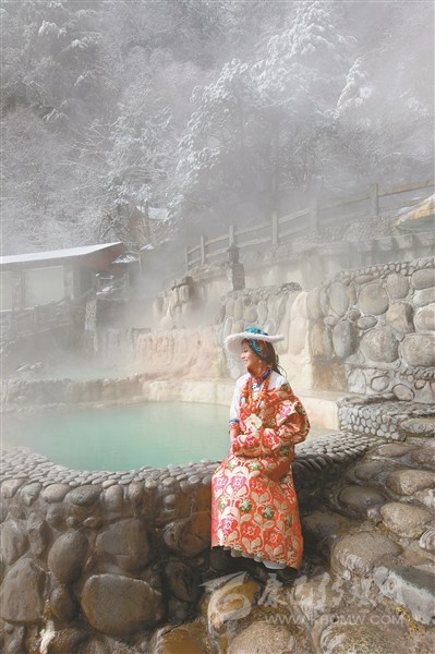 圖為游客在海螺溝冰川溫泉度假村拍攝藝術照。