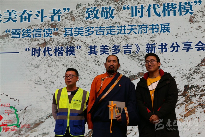 分享會(huì)的座位上,精美禮品袋里裝放著今天的“主角”——新書(shū)《雪線信使——“時(shí)代楷模”其美多吉》。翻開(kāi)書(shū)本,“他是流浪地球上的康巴漢子”“他是圣潔甘孜的大愛(ài)之人”“他是絨麥峨扎的忠誠(chéng)信使”的句子映入眼簾。