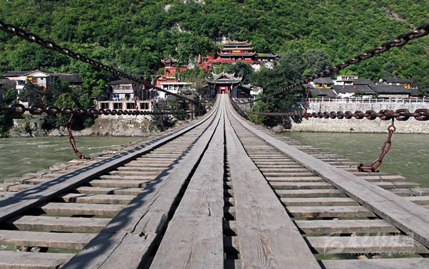 手握粗大烏黑的鐵鏈,感覺(jué)得到它的滄桑歷史與厚重沉淀,當(dāng)年的工匠甩起膀子捶打鐵鏈時(shí)四處飛濺的火星,仿佛在眼前不停噴酒;扣住碩大亮堂的鐵環(huán),簡(jiǎn)直是在觸摸久遠(yuǎn)歲月的流失與人非物是的變故;當(dāng)年匠人舉著大手操起鐵鉗子將滾燙通紅的鐵環(huán)放入水中時(shí)發(fā)出“哧哧哧哧”的聲音似乎在耳旁久久回蕩;踩踏橋面上的板子,分明看見(jiàn)當(dāng)年舍死忘死的勇士們?cè)谙鯚煆椨曛匈橘肭斑M(jìn),犧牲紅軍戰(zhàn)士殷紅的鮮血染紅了大渡河的浪花;凝視滾滾翻騰的波濤,依稀可見(jiàn)當(dāng)年民眾將鐵鏈糸在竹筒上兩頭對(duì)拉的場(chǎng)景,眾人在兩岸使力時(shí)發(fā)出“嗨約嗨約”的吆喝聲地動(dòng)山搖震撼人心……