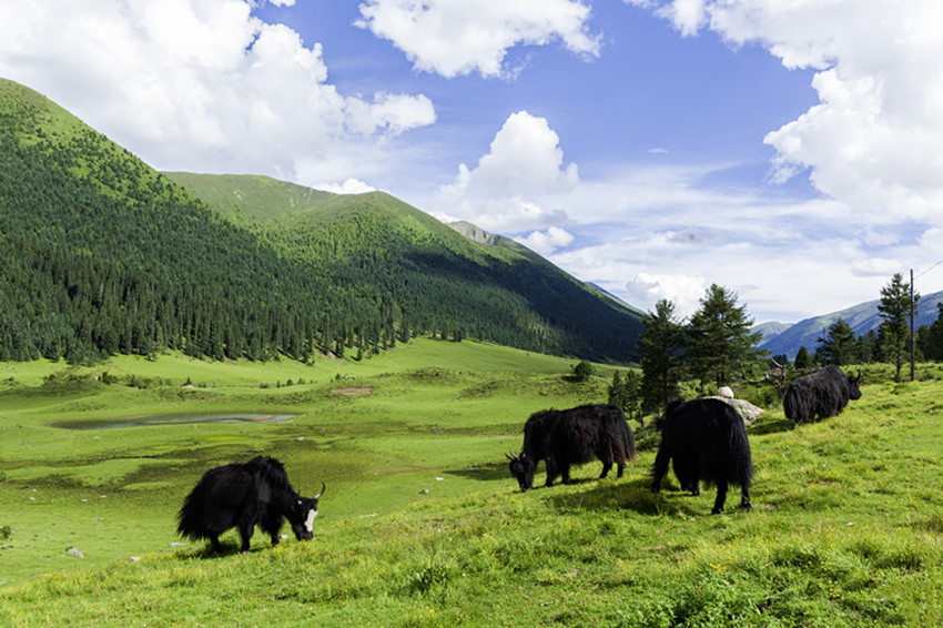 玉科,白猞猁皮鋪展開的長長山谷,依尼山是其心臟,扎拉山脈是其頭,噶科河、瑪科河是其雙臂,惹智塘和曲赤塘是其胸膛,革科和慶切科是其雙腳,措達以下則是其尾。這片山川地勢,晶瑩的雪峰、郁郁蔥蔥的林海、翠綠的草甸,清澈的碧湖,湛藍如洗的天空、潔白的云朵,棲息著豐富的珍稀動植物,構(gòu)成了一幅如詩如畫、動人心魄的原生態(tài)畫卷。一年四季景致千姿百態(tài),美不勝收。夏三月,百花盛開,大地鋪展五彩錦緞。秋三月,一片金黃,映襯得山崗黃燦燦。冬三月,雪花翻飛,大地銀裝素裹。難怪旅游達人們要驚呼,贊美這里是甘孜的阿勒泰。