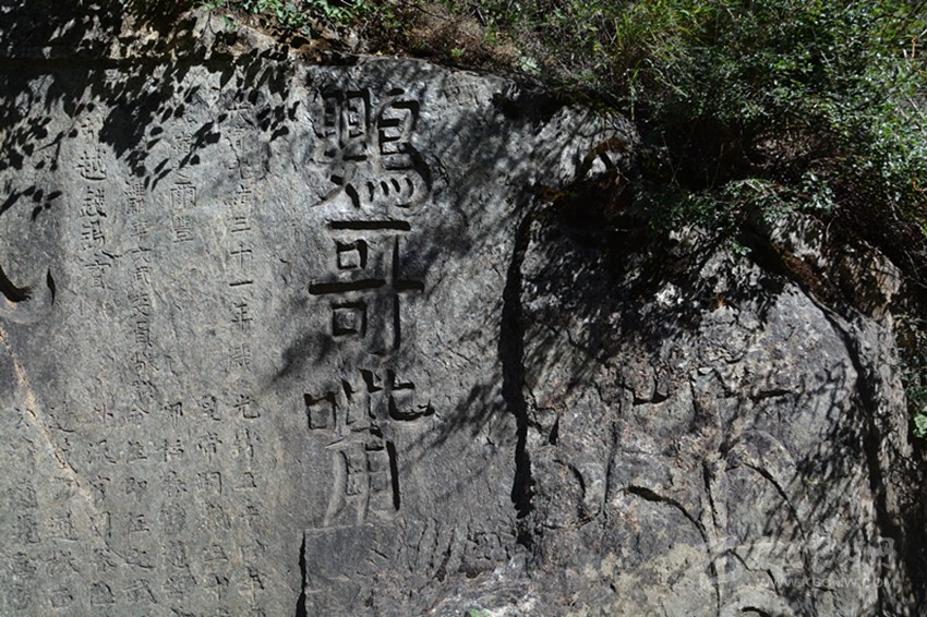 《竺國(guó)通衢》刻在一顆大石頭的下部,石高約三米,長(zhǎng)約六米,刻于清道光年間,意為通向印度的通道,充分說(shuō)明這條道路的價(jià)值和作用。大石和字已藏在核桃樹(shù)下,勢(shì)大必難除,加之雨水侵蝕下已風(fēng)化嚴(yán)重。