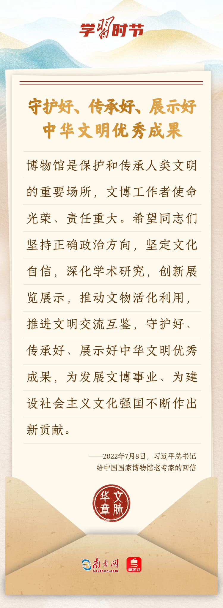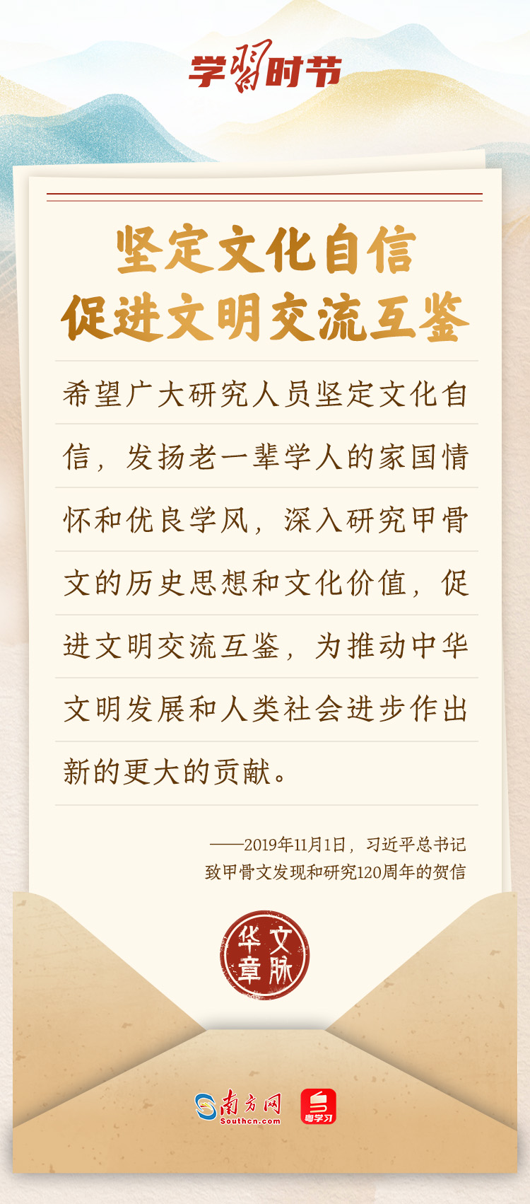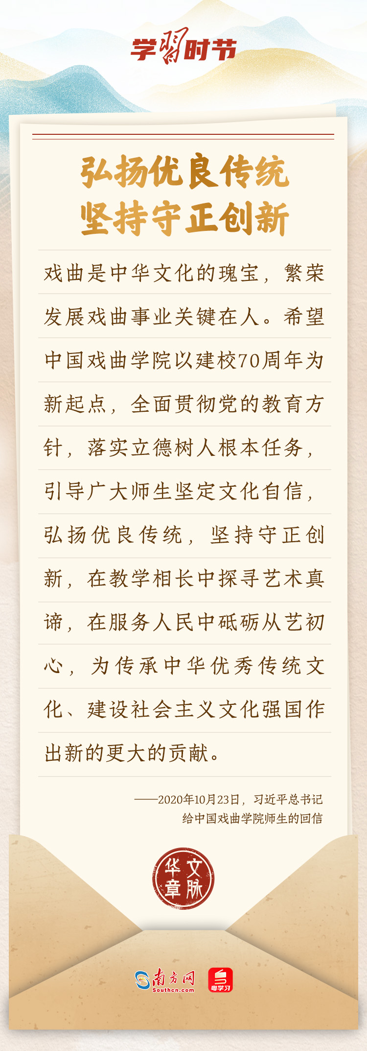 “中華民族在幾千年歷史中創(chuàng)造和延續(xù)的中華優(yōu)秀傳統(tǒng)文化,是中華民族的根和魂。”習(xí)近平總書(shū)記多次通過(guò)發(fā)賀信、寫(xiě)回信等方式,表達(dá)著對(duì)弘揚(yáng)中華優(yōu)秀傳統(tǒng)文化的殷切希望,飽含深情、字字暖心、催人奮進(jìn)。讓我們一起“讀”信。