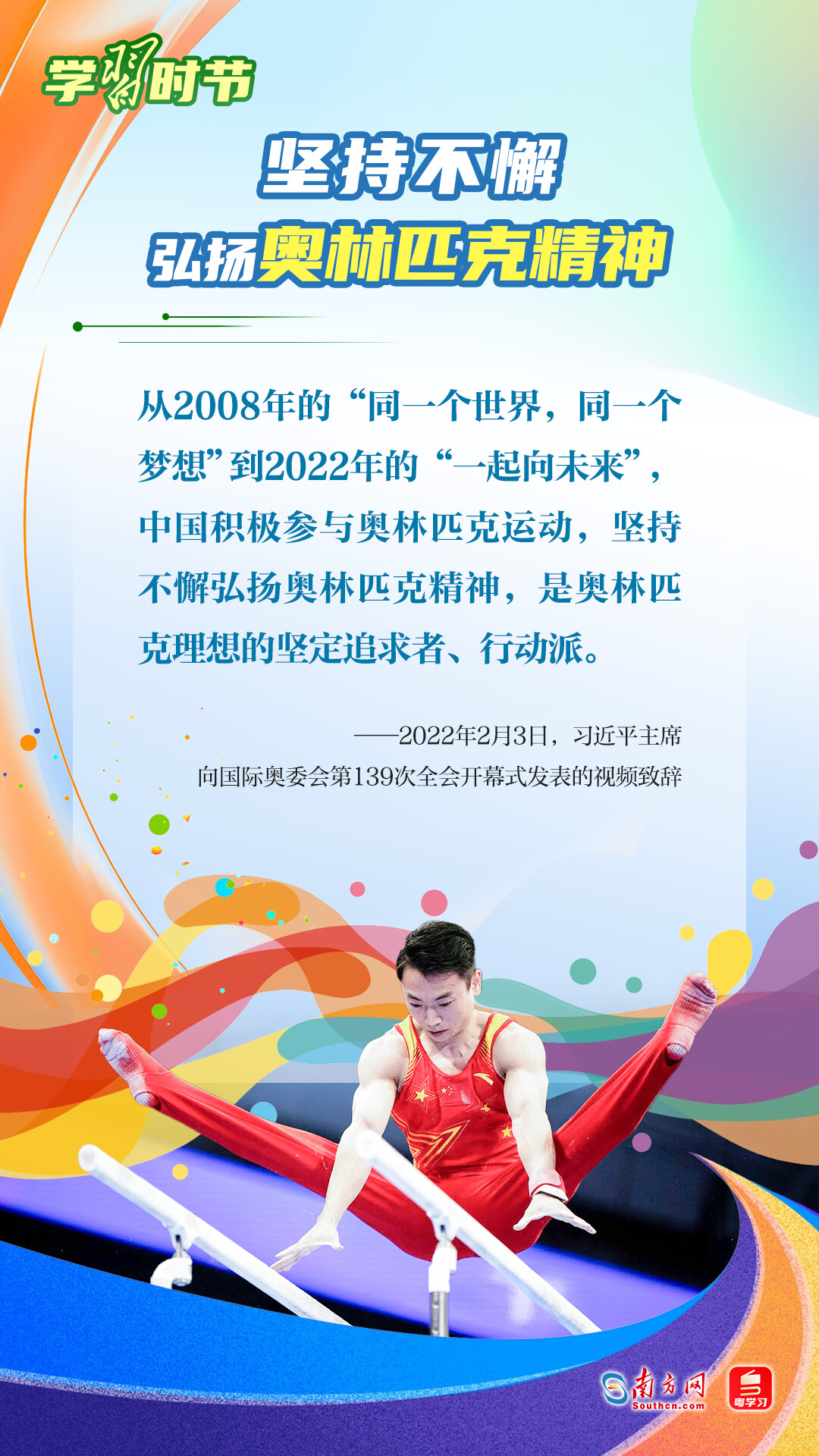 “我們不以勝負(fù)論英雄,同時(shí)英雄就要敢于爭(zhēng)先、敢于爭(zhēng)第一?!绷?xí)近平總書記曾在不同場(chǎng)合論述奧林匹克精神,深刻闡明了勝與負(fù)、成與敗的辯證關(guān)系,對(duì)奧林匹克“更快、更高、更強(qiáng)——更團(tuán)結(jié)”的格言進(jìn)行詮釋。讓我們一同學(xué)習(xí)習(xí)近平總書記對(duì)奧林匹克精神的重要論述,心懷夢(mèng)想、奮勇拼搏,攜手走向美好明天。
