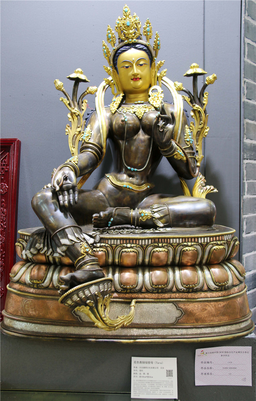 本網(wǎng)訊(記者 宋志勇 文/圖)“這是由什么材料鑄成的物件?”“這件作品的寓意是什么?”“這是一件花色青銅《綠度母佛像》,分別由金、銀、銅鑄成,高100cm、寬50cm,綠度母為觀世音菩薩的化身?!?月12日是第十四屆中國(深圳)國際文化產(chǎn)業(yè)博覽交易會(huì)第三天,甘孜展館迎來了眾多參觀者,在館內(nèi)市民正與白玉縣董察文化發(fā)展有限責(zé)任公司董事長日多一問一答。