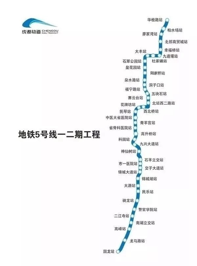5號線一二期線路全長49.02km,設(shè)車站41座,其中地下站36座,高架站5座,換乘站4座(5號線開通時(shí))。其中,一期工程由華桂路向南引出至騎龍站,二期工程由騎龍站向南引出至回龍站。