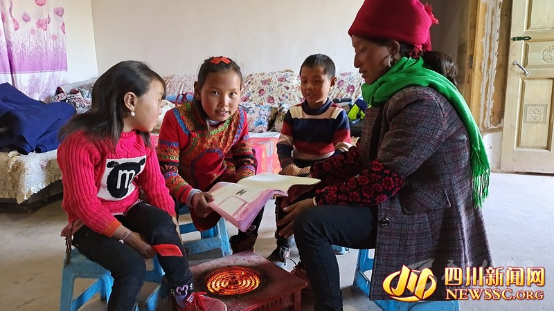 吉好有果(左二)電火爐旁給媽媽讀課文