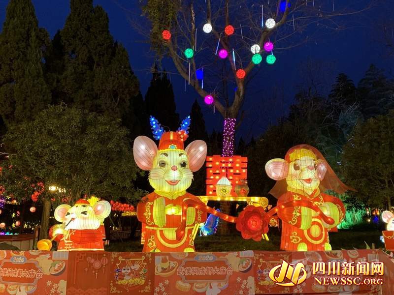 據(jù)成都武侯祠博物館工作人員介紹,“2020武侯祠成都大廟會”對燈組景觀和光影效果進行了全面升級,正門燈組主架構(gòu)以漢闕風(fēng)格和傳統(tǒng)吉祥圖案為基本元素,中為成都傳統(tǒng)民俗IP喜神主題的諸葛亮形象,兩側(cè)為兩只活潑可愛的生肖鼠,為游客送上“吉祥如意”和“鼠年大吉”的祝福。西區(qū)廣場和軸線兩大燈組分別以“喜神送寶”和“魅力天府”為主題,將生肖鼠和紅包、祥云、銀杏等吉祥元素相結(jié)合,營造溫馨、浪漫和喜慶的節(jié)日氛圍,呈現(xiàn)出吉慶祥和、物豐民富、前程似錦的魅力天府景象。西區(qū)湖面“三顧草廬”大型燈組長寬均達50米,高度超過20米,為歷屆廟會之最,形象上以大型彩燈描繪歷史故事,展示武侯祠作為“三國圣地”的厚重歷史底蘊,配合蓮花、仙鶴、祥云、福樹等點綴和流水追光,將宏大敘事和細節(jié)裝飾完美融合。