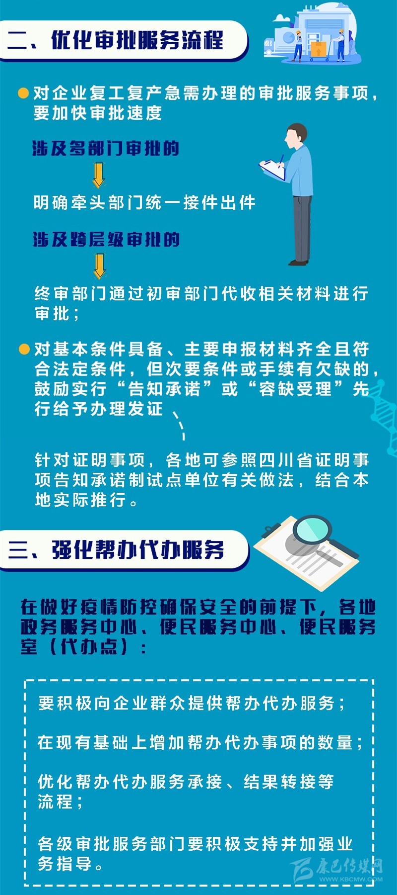 答:優(yōu)化服務(wù)流程,輔以靈活使用“告知承諾”和“容缺受理”等辦理方式。對(duì)企業(yè)復(fù)工復(fù)產(chǎn)急需辦理的審批服務(wù)事項(xiàng),要加快審批速度,涉及多部門審批的,明確牽頭部門統(tǒng)一接件出件;涉及跨層級(jí)審批的,終審部門通過初審部門代收相關(guān)材料進(jìn)行審批。
