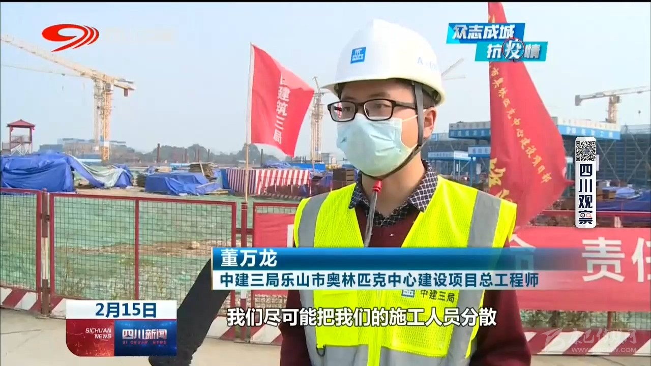 中建三局樂山市奧林匹克中心建設項目總工程師 董萬龍:“我們盡可能把我們的施工人員分散,不要聚集,對內(nèi)我們做好防控物資的保障,口罩、消毒水以及酒精這些防疫物資已經(jīng)齊全。”