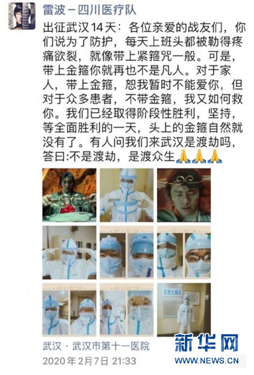 據(jù)雷波介紹,他所在的四川第一批援助湖北醫(yī)療隊的醫(yī)護人員都是各大醫(yī)院的中堅力量,出生于上世紀70年代末至80年代中期的比較多。這代人應該都看過周星馳的電影,應該對《大話西游》比較熟悉,能產(chǎn)生共鳴。