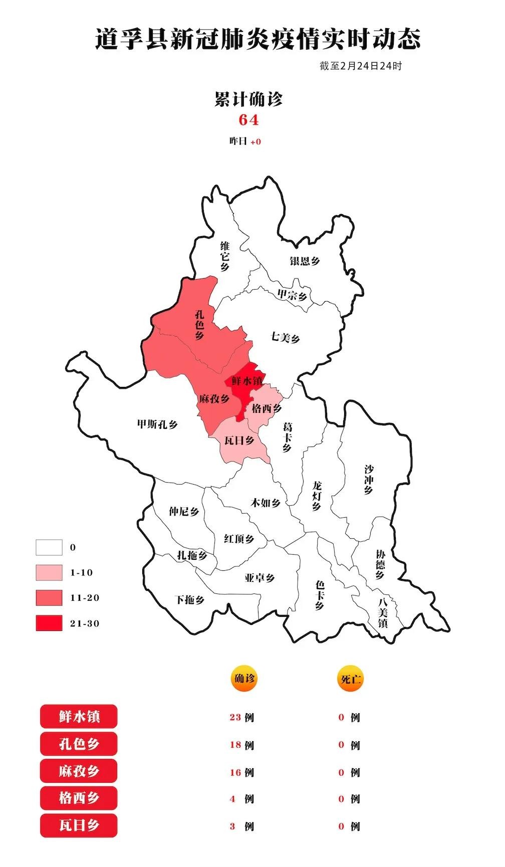 截止2月24日24時,我州累計報告新型冠狀病毒肺炎確診病例69例(道孚64例、康定2例、色達2例、稻城1例),其中累計治愈出院18例(道孚縣13例、康定市2例、色達縣2例、稻城縣1例),在治重癥5例,危重癥1例,其余患者病情穩(wěn)定,均在定點醫(yī)院接受治療。其中,男性39例,女性30例,最大的77歲,最小的3歲。累計確診病例中:5人有武漢旅居史,1人從雅安返回,2人從成都返回,1人從西藏返回、60人為道孚縣常住人口。尚在接受隔離醫(yī)學(xué)觀察的密切接觸者341人。各縣(市)確診病例情況表