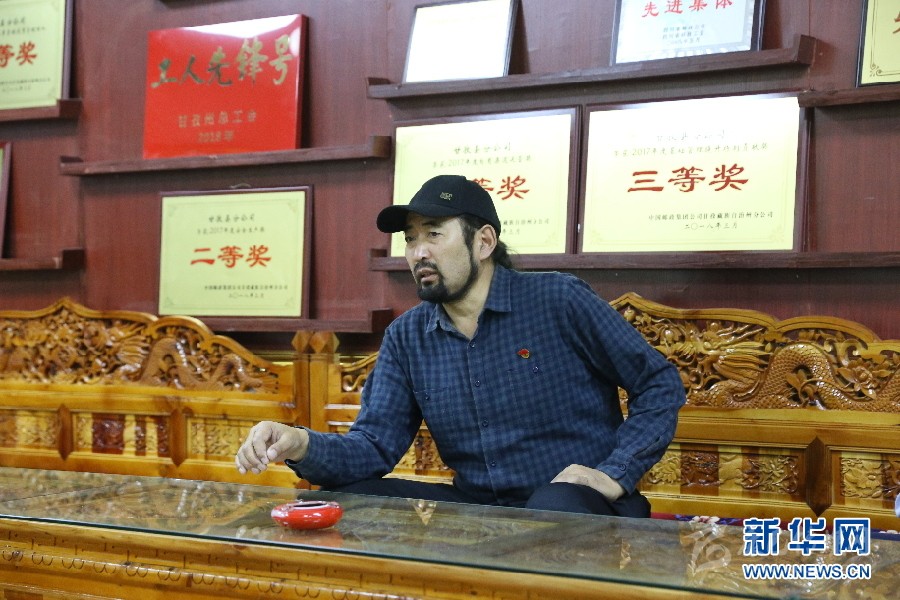 (其美多吉接受采訪,背后的墻上掛滿他和集體的各項榮譽。 新華網(wǎng) 曹鵬 攝)