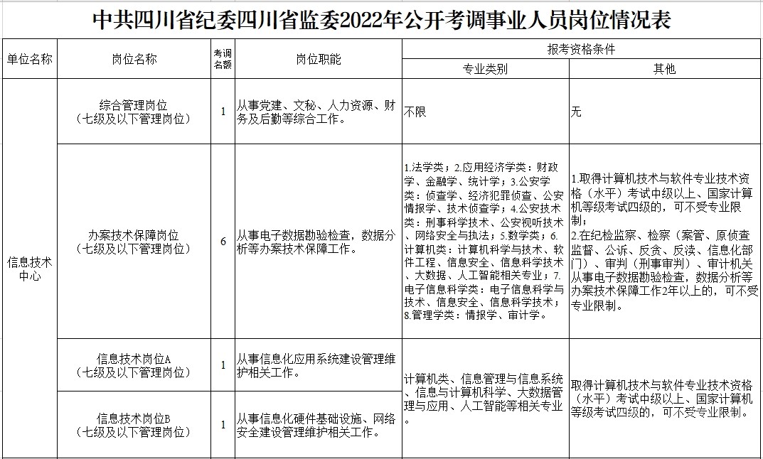 考調(diào)名額 考調(diào)事業(yè)人員25名。其中,信息技術(shù)中心管理崗位9名,黨風(fēng)廉政建設(shè)研究教育中心管理崗位6名、專業(yè)技術(shù)崗位3名,金泉辦案服務(wù)中心管理崗位7名。 考調(diào)對(duì)象及條件 考調(diào)對(duì)象 全省范圍內(nèi)行政單位或參公事業(yè)單位一級(jí)主任科員(含)以下職級(jí)及相當(dāng)職務(wù)層次人員;縣級(jí)及以上公益一類或全額撥款事業(yè)單位管理崗位七級(jí)及以下職員、專業(yè)技術(shù)崗位中級(jí)及以下工作人員。 考調(diào)條件 具有良好的政治素質(zhì)、專業(yè)素養(yǎng),品行端正,實(shí)績(jī)突出,群眾公認(rèn)。 中共黨員。 全日制大學(xué)本科及以上學(xué)歷,并取得相應(yīng)學(xué)士及以上學(xué)位。 年齡35周歲以下(1986年2月11日及以后出生)。 歷年年度考核均為合格(稱職)及以上。 身體心理健康,具有正常履行職責(zé)的身體條件和心理素質(zhì)。 符合報(bào)考崗位規(guī)定的資格條件,詳見(jiàn)《中共四川省紀(jì)委四川省監(jiān)委2022年公開(kāi)考調(diào)事業(yè)人員崗位情況表》(附后)。 符合法律、法規(guī)規(guī)定的其他條件。 有關(guān)時(shí)間計(jì)算均截至2022年2月11日。 具有下列情形之一的,不得報(bào)考: 被依法列為失信聯(lián)合懲戒對(duì)象的。 涉嫌違紀(jì)違法正在接受有關(guān)專門(mén)機(jī)關(guān)審查尚未作出結(jié)論的。 受過(guò)黨紀(jì)政務(wù)處分或司法機(jī)關(guān)刑事處罰的。 受到誡勉、組織處理等影響期未滿或期滿影響使用的。 按照有關(guān)規(guī)定,到定向單位工作未滿服務(wù)年限或有其他限制性規(guī)定的。 尚在試用期的。 按照相關(guān)規(guī)定應(yīng)當(dāng)回避的。 法律、法規(guī)規(guī)定的其他情形。 報(bào)名及打印準(zhǔn)考證 2022年2月22日上午8:00至2月26日下午18:00,報(bào)名人員登錄四川省人力資源和社會(huì)保障廳官網(wǎng)(http://rst.sc.gov.cn/)首頁(yè)“人事考試”專欄進(jìn)行網(wǎng)上報(bào)名,每人限報(bào)一個(gè)崗位。 對(duì)報(bào)名人員進(jìn)行網(wǎng)上資格初審,通過(guò)資格初審者可于2022年3月1日上午8:00至3月2日下午18:00,登陸報(bào)名系統(tǒng)打印筆試準(zhǔn)考證。 考試 考試分筆試和面試。其中,信息技術(shù)崗位A、信息技術(shù)崗位B、宣傳專業(yè)技術(shù)崗位需加試專業(yè)測(cè)試。 根據(jù)筆試情況,擇優(yōu)確定進(jìn)入面試的人選,并適時(shí)開(kāi)展資格復(fù)審和心理素質(zhì)測(cè)試。資格復(fù)審、心理素質(zhì)測(cè)試、面試時(shí)間和地點(diǎn)另行電話通知。 考察、體檢及試用 考察 根據(jù)考試情況,擇優(yōu)差額確定進(jìn)入考察對(duì)象,深入考察了解人選政治表現(xiàn)、工作能力、廉潔自律和性格特點(diǎn)等。 體檢 根據(jù)考察情況和職位要求,擇優(yōu)等額確定進(jìn)入體檢人選,參照《公務(wù)員錄用體檢通用標(biāo)準(zhǔn)(試行)》進(jìn)行體檢。 頂崗試用 綜合人選考試成績(jī)、考察情況,根據(jù)工作需要和人崗相適原則,擇優(yōu)確定頂崗試用人選。 調(diào)入 試用期滿后,根據(jù)考調(diào)名額和試用期間表現(xiàn),研究確定擬調(diào)人員,經(jīng)公示后按規(guī)定程序辦理調(diào)入手續(xù)。 注意事項(xiàng) 報(bào)考者應(yīng)保證提供真實(shí)、準(zhǔn)確、全面的個(gè)人信息和資料,如有弄虛作假的行為,將按有關(guān)規(guī)定嚴(yán)肅處理。 資格審查貫穿考調(diào)全過(guò)程,任一環(huán)節(jié)發(fā)現(xiàn)有不符合考調(diào)條件的,取消考調(diào)資格。 報(bào)名時(shí)請(qǐng)按要求填寫(xiě)本人手機(jī)號(hào)碼,并保持通訊暢通。未入圍下一環(huán)節(jié)人員,不再另行通知。 進(jìn)入資格復(fù)審者,需由有干部管理權(quán)限的主管部門(mén)出具同意考調(diào)的書(shū)面意見(jiàn)并加蓋公章。 嚴(yán)明考調(diào)紀(jì)律,報(bào)名者不得托人說(shuō)情、打招呼,一經(jīng)發(fā)現(xiàn)即取消資格。 遵守疫情防控相關(guān)規(guī)定,服從工作人員安排。 同時(shí),四川省紀(jì)委監(jiān)委還提供相關(guān)咨詢電話:028—62555435;62555354。 (點(diǎn)擊查看大圖)