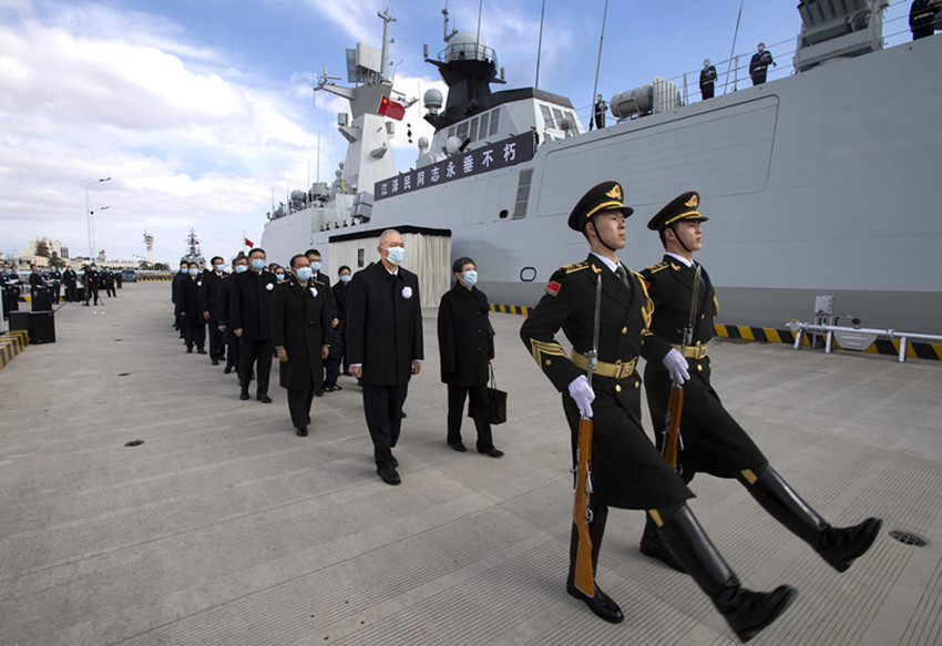 中國人民解放軍海軍揚(yáng)州艦伏波靜臥,艦上官兵分區(qū)列隊、肅立舷邊。揚(yáng)州是江澤民同志的故鄉(xiāng)。今天,這艘以揚(yáng)州命名的軍艦,以最高禮儀送別這位為黨和人民建立了不朽功勛的卓越領(lǐng)導(dǎo)人。江澤民同志的親屬捧護(hù)著骨灰登上揚(yáng)州艦。海軍笛吹響,儀仗隊持槍肅立,行注目禮。當(dāng)揚(yáng)州艦起航時,軍港內(nèi)所有艦船汽笛長鳴,響徹云霄。