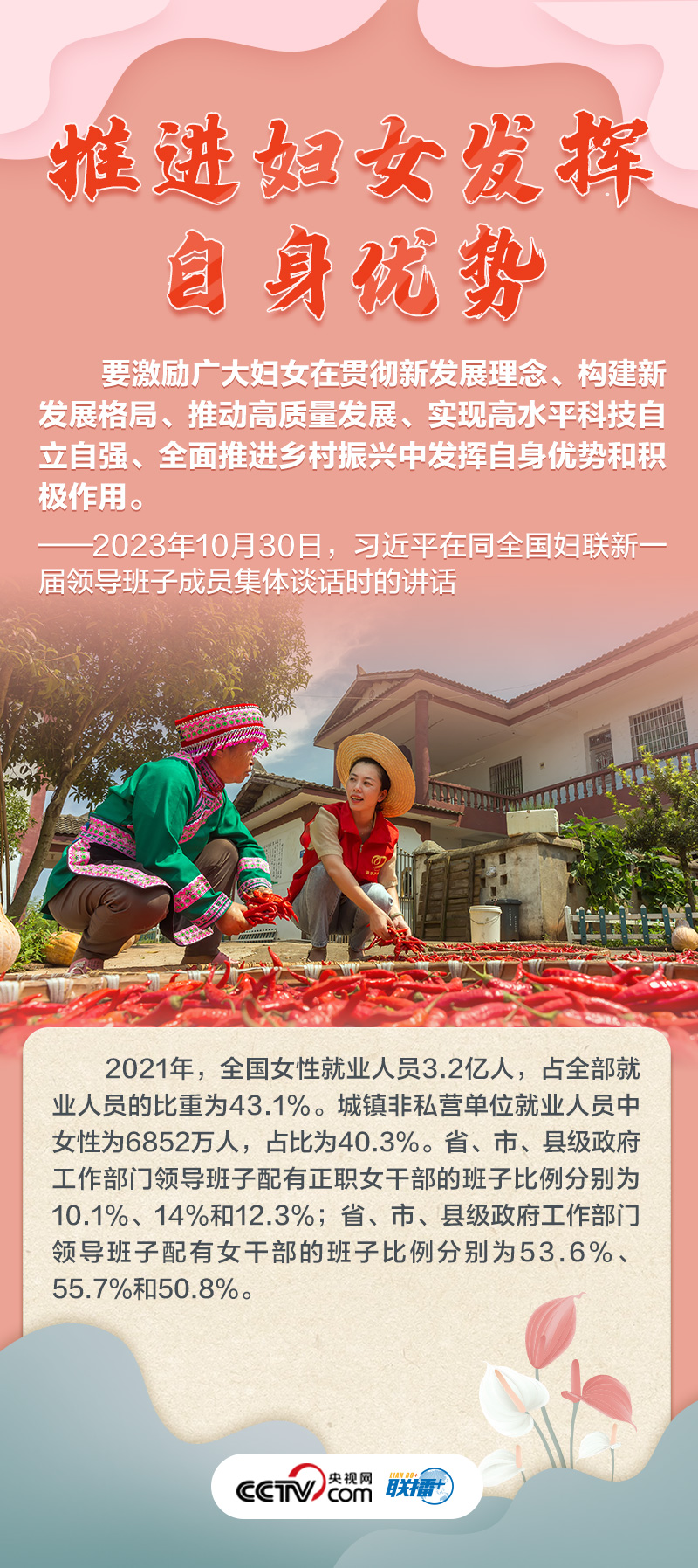 聯(lián)播+“婦聯(lián)是黨和政府聯(lián)系婦女群眾的橋梁紐帶?!?0月30日,習(xí)近平總書記同全國婦聯(lián)新一屆領(lǐng)導(dǎo)班子成員集體談話并發(fā)表重要講話,高度肯定巾幗力量,并為新形勢下婦女事業(yè)和婦聯(lián)工作發(fā)展指明方向。