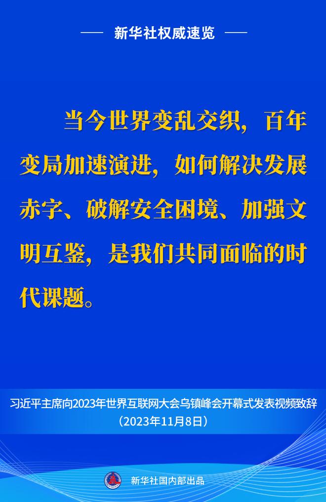 11月8日上午,國(guó)家主席習(xí)近平向2023年世界互聯(lián)網(wǎng)大會(huì)烏鎮(zhèn)峰會(huì)開(kāi)幕式發(fā)表視頻致辭。一起來(lái)看金句。
