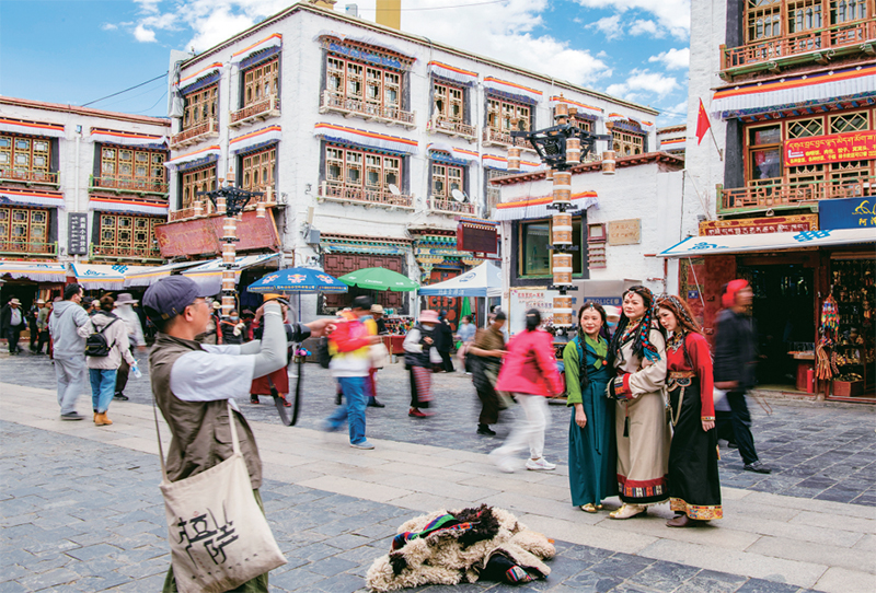 千年八廓街,見證民族團(tuán)結(jié)。2021年7月,習(xí)近平總書記來到位于西藏拉薩老城區(qū)的八廓街,感慨地說:“千年八廓街,是我們各民族建起來的八廓街。各民族文化在這里交流交往交融,我們中華民族的大家庭在這里其樂融融。”圖為2023年6月13日,游客身著藏裝在八廓街拍照留念。 新華社記者 姜帆/攝