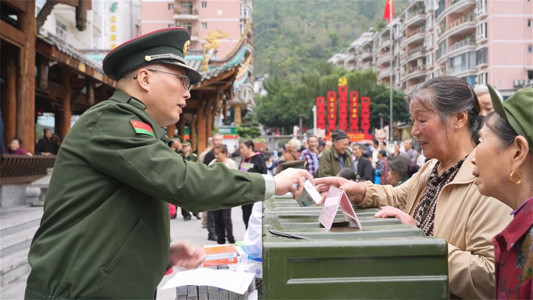 圖為在義診現(xiàn)場(chǎng),藥師為患者發(fā)放免費(fèi)藥品,并仔細(xì)叮囑用藥注意事項(xiàng)。