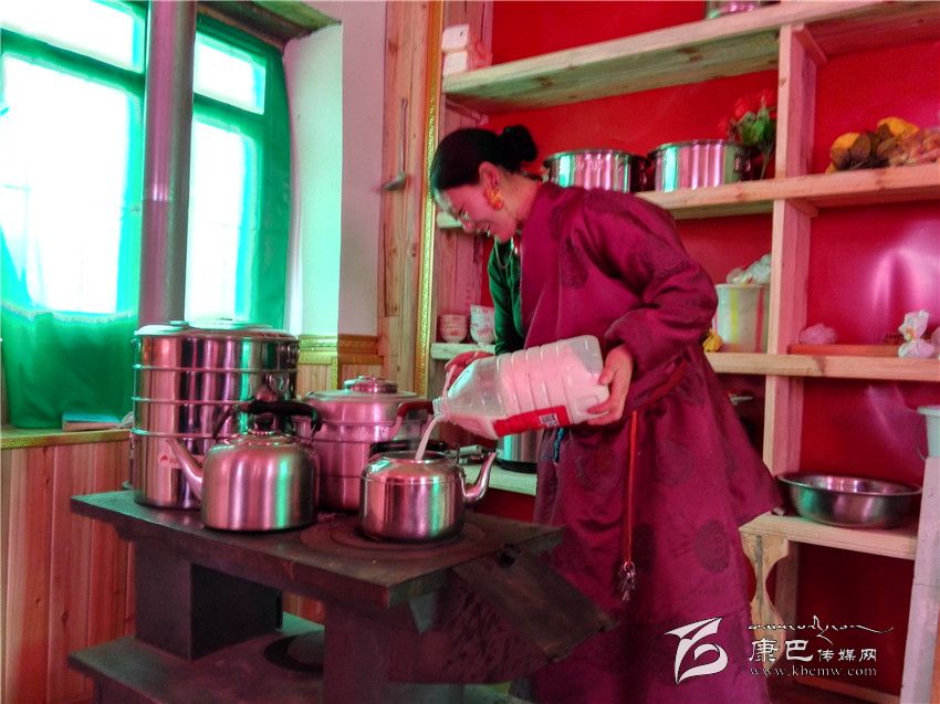 走進江巴達吉的家里,一股熱浪撲面而來,小鋼爐上燒著熱水,幾個女人正在備料準(zhǔn)備包酥油包子和牛肉餃子。藏桌上擺滿了糖果、牛肉,豐盛的食物琳瑯滿目。江巴達吉愜意地喝著奶子茶,知足和幸福寫在臉上。