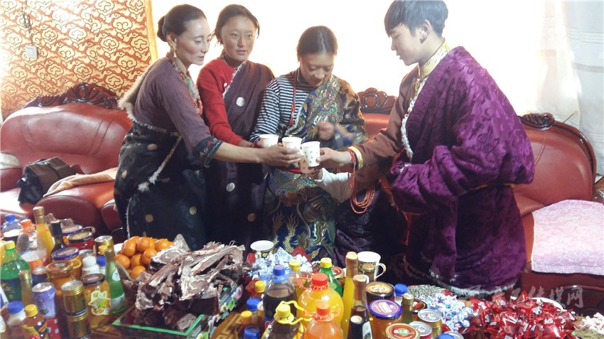 根秋卓瑪一家是俄多瑪鄉(xiāng)的村民,初一一大早,根秋卓瑪就穿上節(jié)日的盛裝?!敖裉煳覀円涯曦洈[放出來,等親戚朋友祈?;貋恚覀円患揖蜁谝黄?,拉著家常、吃著美食、唱著山歌,高高興興歡度藏歷新年?!备镒楷斦f。