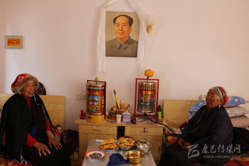 從餐廳出來,記者走進了一間15平方米左右的宿舍。兩位老人正坐在各自的木床上看電視,墻上掛著的液晶電視是連著機頂盒的。兩床之間,放著藏桌和床頭柜,藏桌上有瓜子、花生、酥油果子、牛肉等食品,亞瑪翁青老人熱情地說:“因為正在過藏歷新年,這些都是福利院為我們備的年貨,你也嘗嘗!”。房間里最引人注目的便是掛在床頭柜上方的系著哈達的毛主席畫像,兩位老人指著毛主席畫像動情地說:“毛主席、共產黨是我們的恩人,看著他的畫像我們安心。”此外,房間里還有衣柜、配有馬桶的獨立廁所和盥洗臺,毛巾、漱口盅、掃把、拖把都整齊地放在對應位置。亞瑪翁青笑著說:“我們住的房間都趕得上縣城里的賓館了?!?/span>