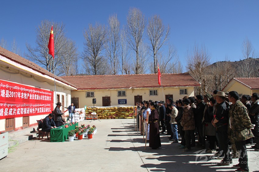 在農(nóng)科所院壩,擺放著縣委政府多方籌資,縣農(nóng)牧和科技局調(diào)運和貯備脫毒馬鈴薯種60萬公斤,青稞良種30萬公斤、農(nóng)膜10噸、肥料120噸、各類蔬菜油菜良種3000公斤,35萬元的黑木耳菌種,分發(fā)給24個鄉(xiāng)鎮(zhèn)、37個脫貧村。為趕這趟“理塘縣2017年農(nóng)牧產(chǎn)業(yè)扶貧放心農(nóng)資發(fā)放儀式”、“理塘縣成片成帶推進(jìn)特色產(chǎn)業(yè)發(fā)展啟動儀式”,降央吉稱專門起了個大早,開著拖拉機“趕”了兩個小時到了農(nóng)科所。
