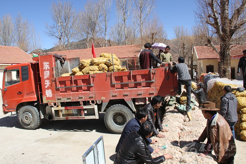 村民正在搬運免費發(fā)放的馬鈴薯等農(nóng)用物資。