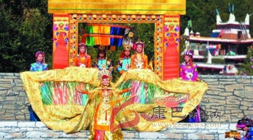 在催人奮進的戰(zhàn)鼓聲中,一群身披甲胄的士兵拿著長劍,背著巨弓走到臺前,在鏗鏘的戰(zhàn)鼓聲中,戰(zhàn)士們做著各種競技動作,模仿武士們互相攻擊的樣子,那矯健的身影展示了遠(yuǎn)古時代嘉絨藏族先民們?yōu)榱松媾c自然努力抗?fàn)幍膱鼍?。過了一會兒音樂一轉(zhuǎn),戰(zhàn)鼓聲漸漸減弱,在鳥雀的陣陣啾啾聲中,一座木門慢慢的開啟,一位身披長袍、頭戴鳳冠的女王在眾多美女的簇?fù)硐拢従徸呦屡_階步入舞臺中央,此時,一位手捧托盤的老者來到女王面前單膝下跪,將托盤高舉過頂,并邀請女王品嘗佳肴,女王將中指在酒中蘸了蘸,并曲起中指向四周輕輕彈去,寓意愿將杯中美酒與四方百姓同飲。在女王面前還放置著一個凈水桶,桶中盛滿了清澈的甘泉,桶上橫放著一枝柏樹枝,女王伸出纖纖玉手,拿著柏樹枝在水中蘸了蘸,面向墨爾多神山撒去,寓意向神山祈福。這是此次《美人谷·丹巴》節(jié)目展演中的序曲部分,有著強烈的東女神韻,將遠(yuǎn)古時代東女國女王遺風(fēng)展演的淋漓盡致。