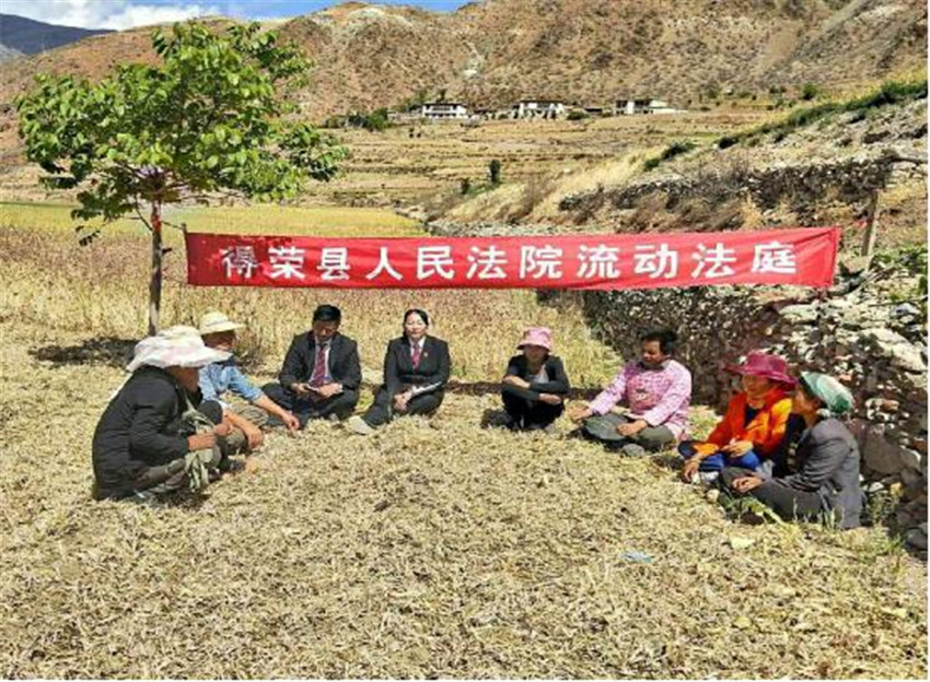在曲雅貢鄉(xiāng)二號(hào)壩村進(jìn)行法律宣講時(shí),村民澤某請求法院判決其和丈夫扎某離婚,“流動(dòng)法庭”法官立即在田間地頭組織調(diào)解。調(diào)解過程中當(dāng)事人情緒抵觸、相互埋怨,尤其涉及到財(cái)產(chǎn)分割和子女撫養(yǎng)等問題時(shí)情緒波動(dòng)大,場面一度僵持。法官憑借豐富的調(diào)解經(jīng)驗(yàn),先從講解相關(guān)法律規(guī)定入手,告知當(dāng)事人享有的權(quán)利義務(wù),而后對離婚財(cái)產(chǎn)分割、子女撫養(yǎng)問題從情理法多角度層層剖析,促使雙方達(dá)成和解協(xié)議,有效化解了矛盾?!傲鲃?dòng)法庭”以宣促調(diào)、以案說法,達(dá)到了審理一案、教育一片、穩(wěn)定一方的效果。