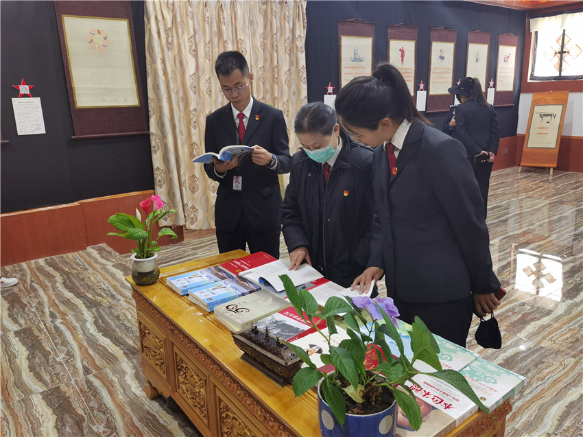 圖為干警們正在參觀黨史新概念唐卡作品。