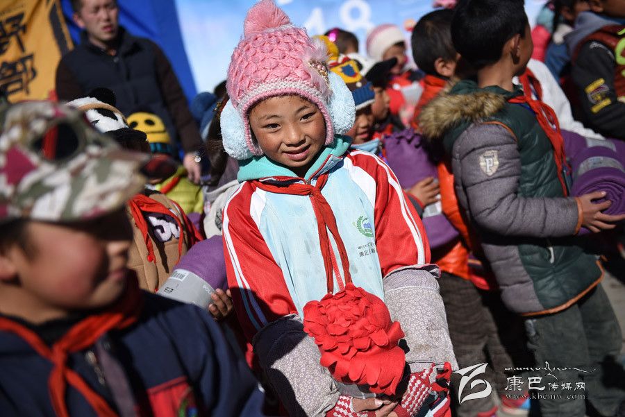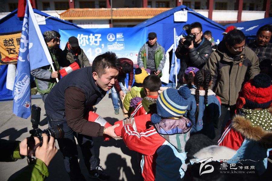 新華網(wǎng)“你好,318”全媒體行活動領(lǐng)隊(duì)黨文伯為孩子送防寒毛毯(薛玉斌 攝)