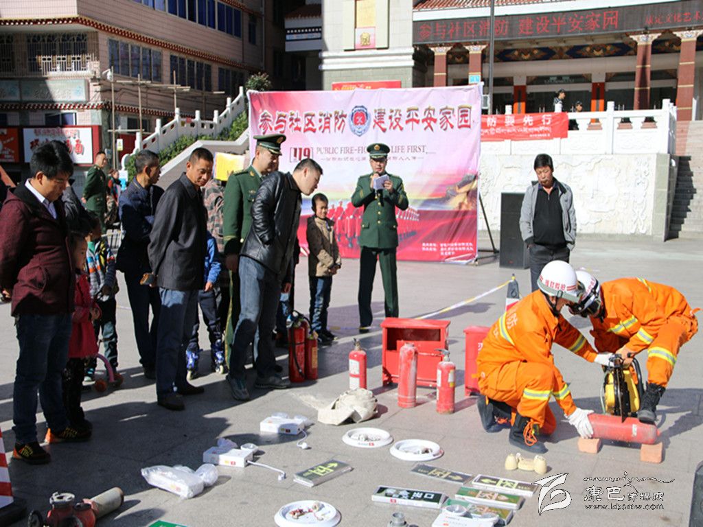 在“119”到來之際,為提高群眾消防安全意識,積極查找身邊火災(zāi)隱患,州公安消防支隊于8日在康定情歌廣場開展“參與社區(qū)消防、建設(shè)平安家園”消防宣傳主題活動?;顒蝇F(xiàn)場除展示了消防器材、消防車輛及宣傳品外,還開展了油盆滅火、銷毀過期消防產(chǎn)品等活動。為提高群眾參與度,本次宣傳活動還采取消防知識有獎趣味問答、關(guān)注微信抽獎等方式進行互動。圖為消防官兵向向群眾展示消防器材。    (記者 楊杰 攝影報道)