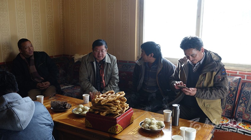 州醫(yī)院院長多吉(中)與鄉(xiāng)村干部共謀發(fā)展大計(jì)。