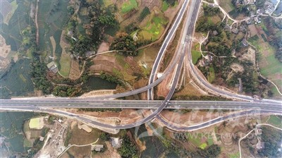 上午11時許,當(dāng)記者驅(qū)車到達(dá)對巖樞紐互通立交,用無人機(jī)從空中俯拍,這個縱橫交錯、恢弘磅礴的交通樞紐,宛如盤旋在云端的銀龍,又似在大地上延伸的血脈,其造型、規(guī)模、結(jié)構(gòu)都令人嘆為觀止。