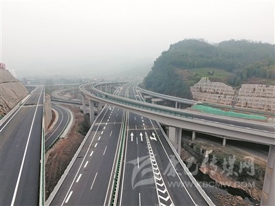 道路兩旁山嶺逶迤,觸目所見的高速公路,幾乎全都搭建在山腰帶際之間,如同蒼山綠水上的一條“彩練”。山河與路橋隧的錯落有致,車上的人便更有一種與藍(lán)天白云的距離越來越近的錯覺。沿線綠化因地制宜,打造水體山體景觀,“車在路上行,路在景中生,人在畫中游”的美感油然而生。